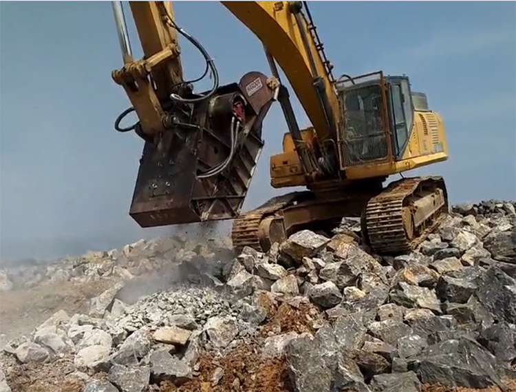 A bucket crusher or crusher bucket is a type of jaw crusher. It's an attached tool for excavators for built-in crushing construction waste and demolition materials. It has the design of a shovel, which is open at the rear for releasing the shredded material. Compared to normal jaw crushers, the jaw crusher bucket has a lower production, but can be transported more easily and only needs an excavator to operate.