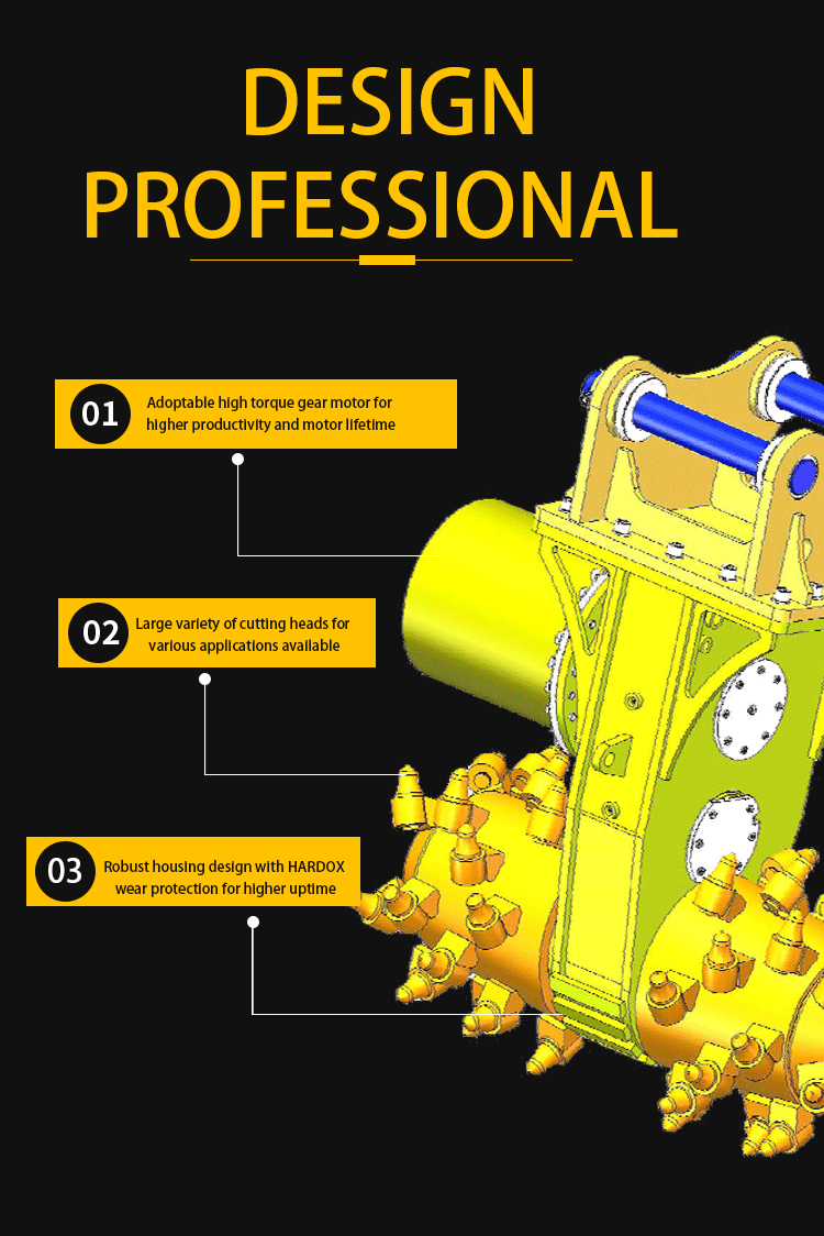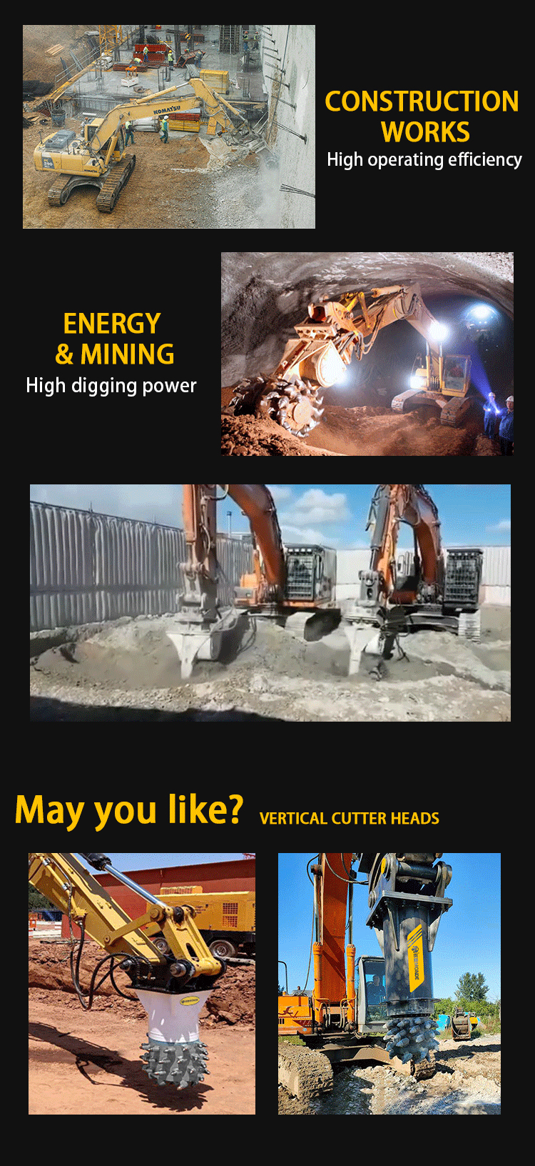 Excavator drum cutter, milling machines, are divided into horizontal and vertical milling machine. It is widely used in open-pit coal mine, tunnel excavation and outline correction, channel groove milling and digging, asphalt concrete pavement milling, rock digging, toots milling, milling of permafrost, iron and steel industry, forestry and other construction field.