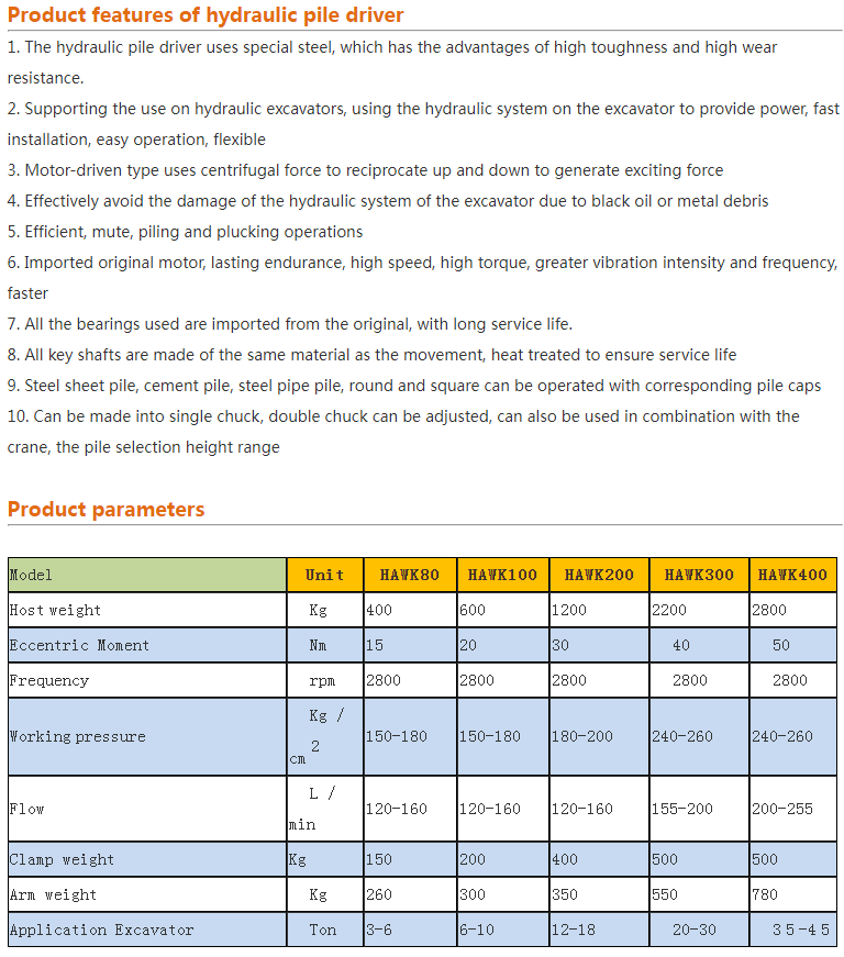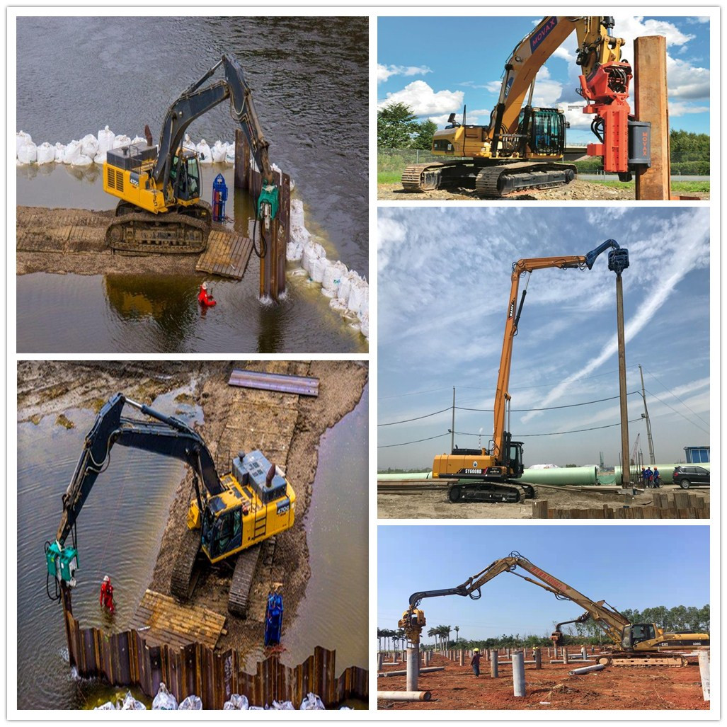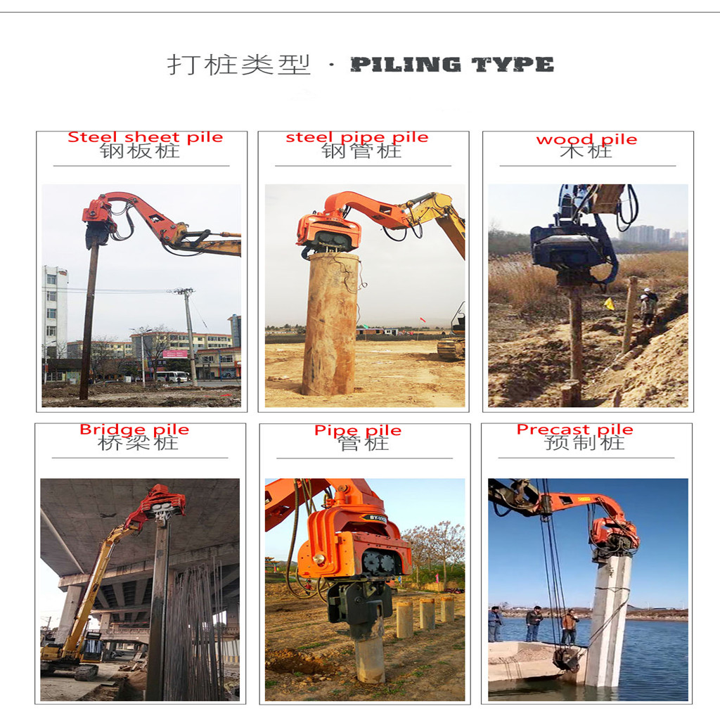 Can be used with all kinds of models of excavator is suitable for large diameter deep foundation pit engineering, large tube pile construction and large steel liners construction engineering, the soft foundation and rotating drill with construction engineering, high speed railway subgrade construction project and foundation, the sea reclamation project and the management of sand pile construction, municipal construction projects, and pipeline construction, sewage treatment and supporting soil retaining engineering, Mainly used in flood control, dam, pipe, earthwork, soil wall slope surface and other occasions. Drive or pull a variety of materials and shapes of the pile, such as steel pile, cement pile, rail pile, iron plate, H plate, drain pipe.